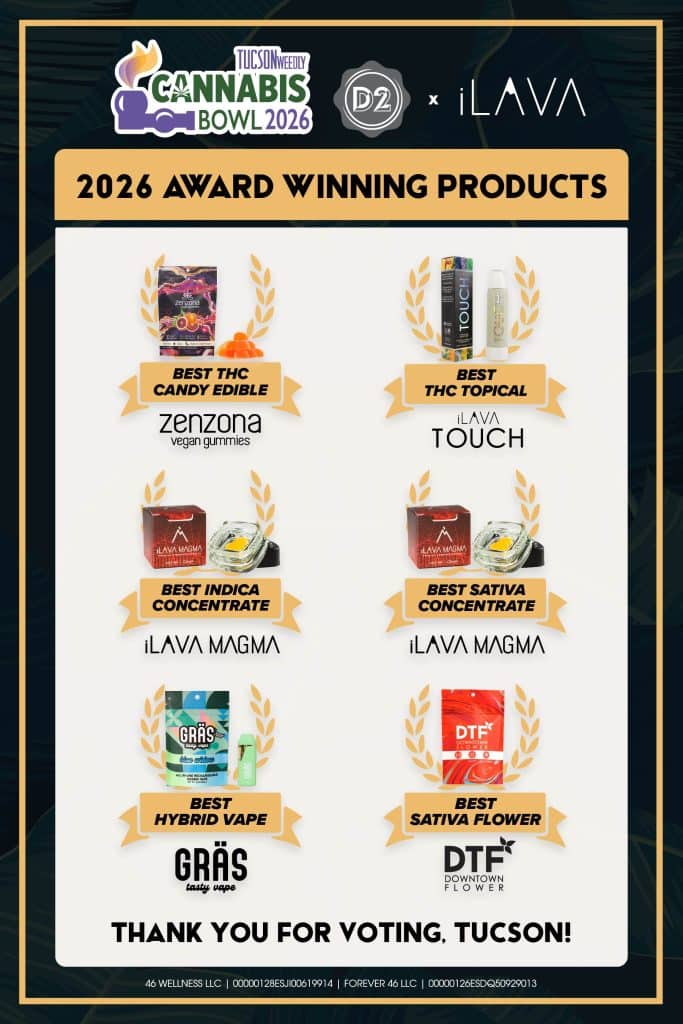 A big thank you to everyone who took the time to vote for our products and our dispensaries in this year’s Tucson Weekly Cannabis Bowl 2026!